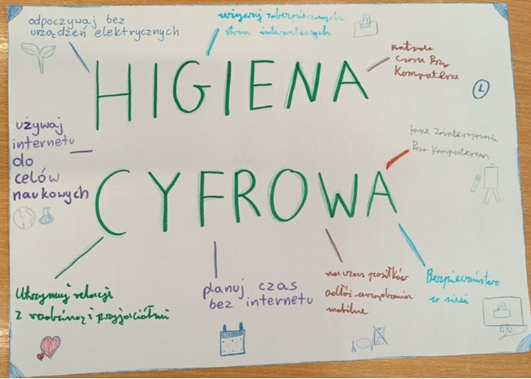 Wzięliśmy udział w akcji pt.: Z higieną cyfrową za pan brat w ramach obchodów Roku Higieny Cyfrowej. Uczestniczyliśmy w burzy mózgów dotyczącej pojęcia higieny cyfrowej. Omówiliśmy także zasady stosowania higieny cyfrowej w praktyce.