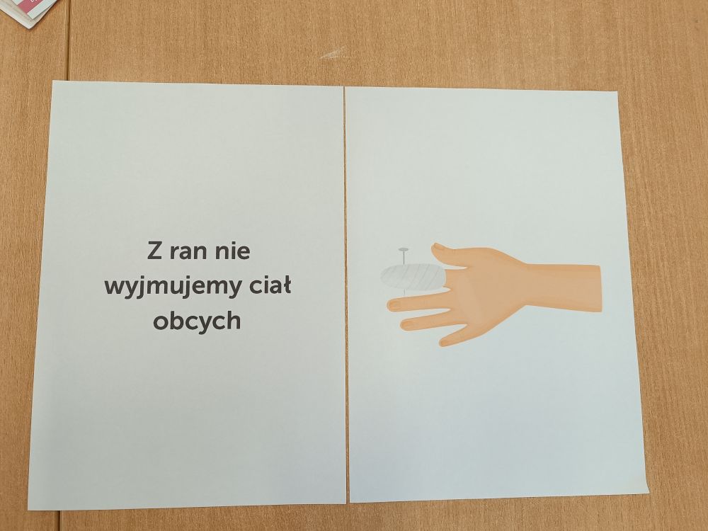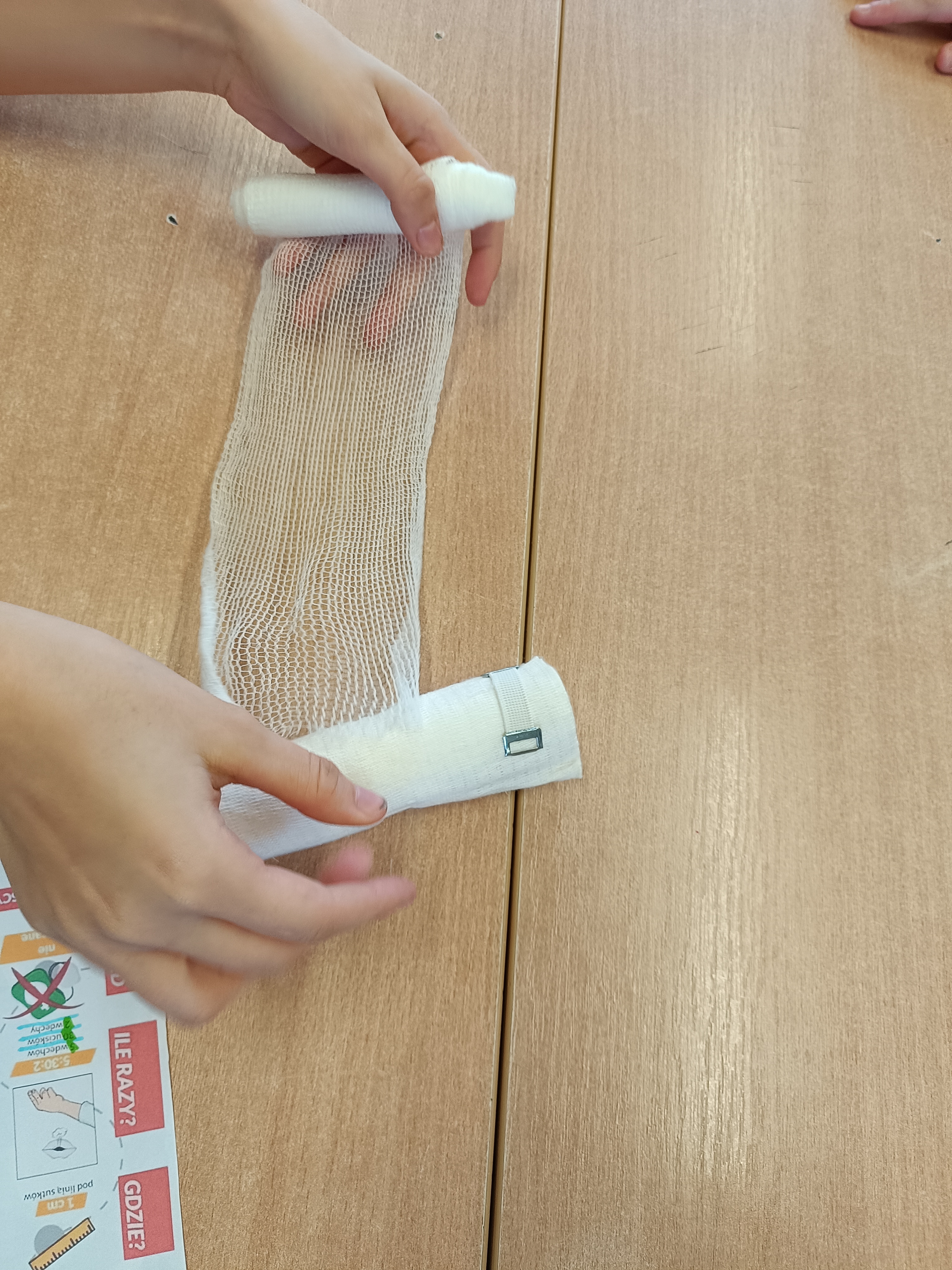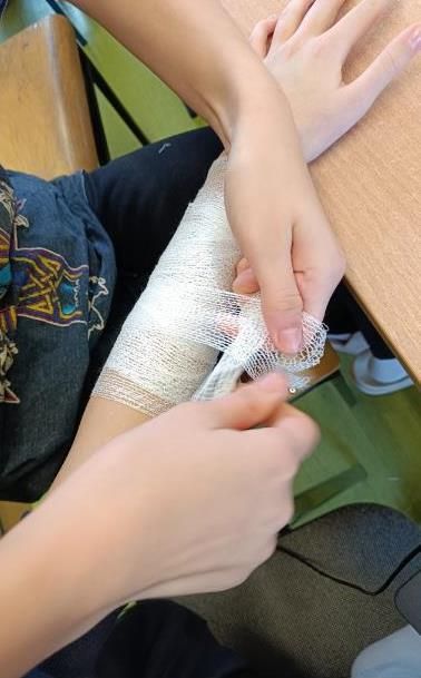 Braliśmy udział w zajęciach dotyczących udzielania pierwszej pomocy. Omówiliśmy podstawowe pojęcia związane z pierwszą pomocą, obowiązkiem udzielania pierwszej pomocy, pozycji bocznej ustalonej, podstawowego wyposażenia apteczki. Na podsumowanie ćwiczyliśmy bandażowanie.